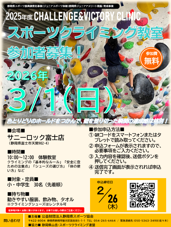 ■日時 令和8年3月1日(日) ■会場■ サニーロック富士店 (静岡県富士市天間902-4) ■時間■ 10:00~12:00 体験教室 ■対象・定員■ 小・中学生 30名(先着順) ■持ち物■ 動きやすい服装、飲み物 等 ※クライミングシューズはレンタル可 ■申込方法■ 下記(Googleフォーム)よりお申込みください。 |